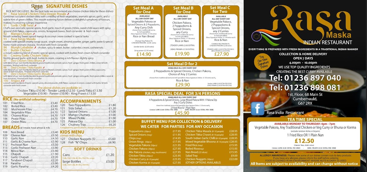 From a reviewer’s perspective, the menu at Rasa Indian Restaurant Cumbernauld feels like a well-rounded showcase of classic and contemporary Indian cuisine, thoughtfully designed to satisfy both adventurous diners and those who prefer familiar comforts. The Chef’s Specialities immediately set the tone, with dishes such as Balti, Chasni, Tikka Tandoori Masala, Garam Masala, and Garlic Masala offering rich, aromatic sauces and layered spices that highlight the kitchen’s confidence and depth of flavour. The Korma selection is particularly impressive, ranging from the mild creaminess of Traditional Korma to the fruity sweetness of Kashmiri Korma, the subtle heat of Ceylonese Korma, and bolder options like Special Korma and Chilli Korma, ensuring there is something for every palate.